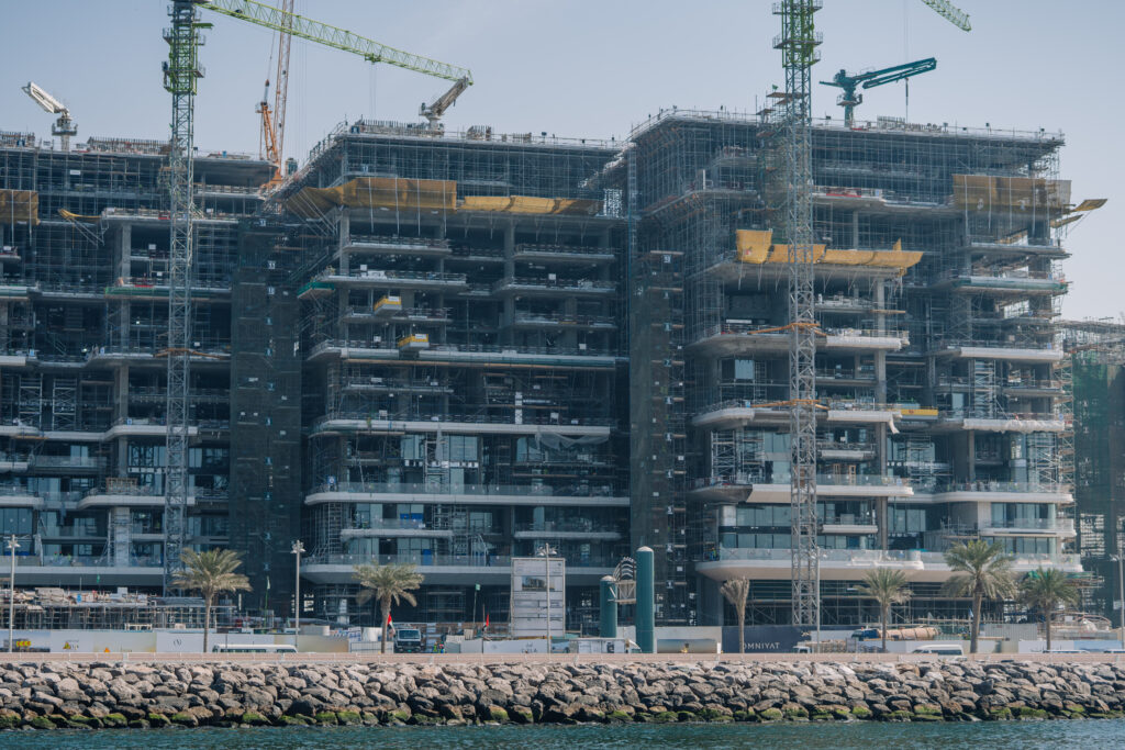 Modern residential building under construction in Dubai with scaffolding, cranes, and palm trees along the waterfront
